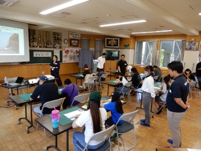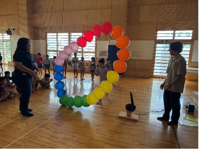 大謝名児童センターの利用者である小学生約40名を対象に,科学アトラクションとして「巨大空気砲」や「風船輪くぐり」といった空気の流れを利用した内容をショー形式で実施した.煙を充填させた巨大空気砲による大きな空気の輪に大きな歓声があがり,空気の輪を目で追う子どもたちの姿や空気砲の仕組みについて真剣に説明を聞く姿,風船輪くぐりでは積極的に輪くぐり体験に挑戦する姿が印象的であった.