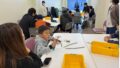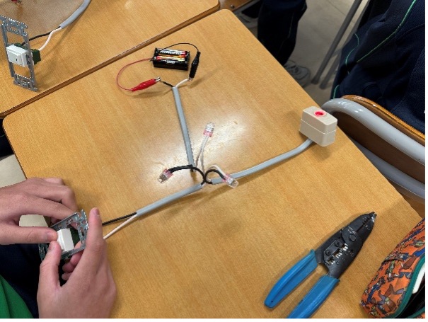 講義の冒頭では講師の経歴や琉球大学総合技術部発足の経緯、技術職員の業務内容について紹介しました。続いて、講義「ドキドキ電気工事!LEDを光らせる回路づくり」では、電気が発電所から住宅・店舗・工場等にどのように送電されるかを説明した後、分電盤からコンセントや照明へ接続されるまでの配線を模した簡易的な電気回路を製作してもらいました。具体的には、VVFケーブルや電線を専用工具で切断し、照明器具やスイッチに接続する作業を通して、LEDが点灯する回路を製作しました。講義の最後には、LEDの発光する仕組みについても説明を行いました。