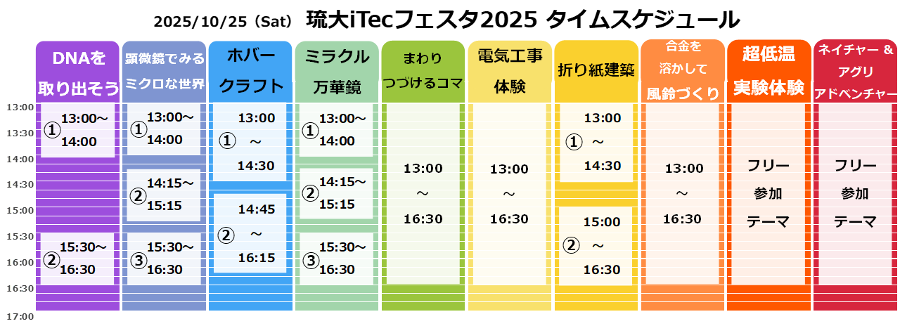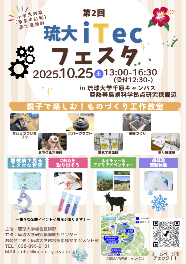 本イベント「琉大iTecフェスタ」は、地域の小学生やその保護者の方々に、日常生活では体験できないような「技術」や「科学」のおもしろさに触れてもらうことで、科学技術に関する知識の普及啓発に寄与し、次世代の科学技術を担う子供達の育成につなげることを目的としています。